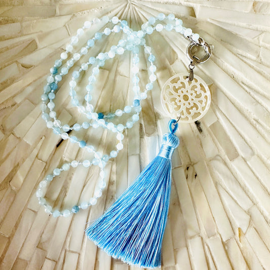 "Perlmutt-Mandala mit Quaste" mit Aquamarin Edelsteinkette