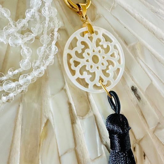 "Perlmutt-Mandala mit Quaste" mit Bergkristall Edelsteinkette