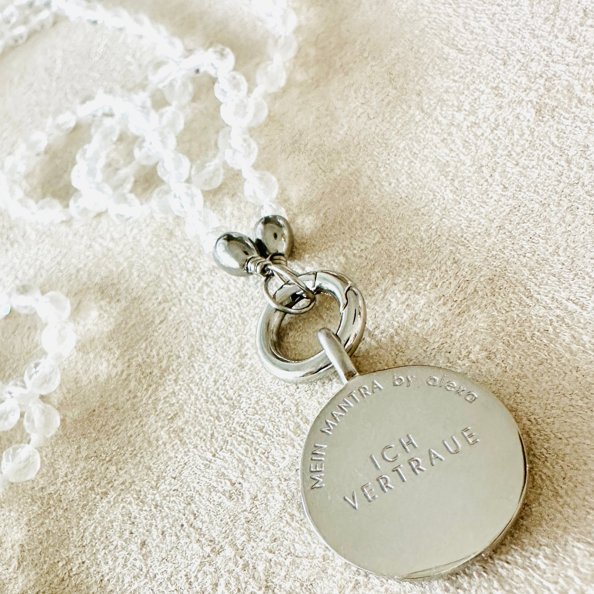 Die Edelsteinkette aus feinem Bergkristall trägt das kraftvolle Mantra „Ich vertraue“ – eingraviert in einen filigranen Mandala-Anhänger aus hochwertigem Edelstahl.