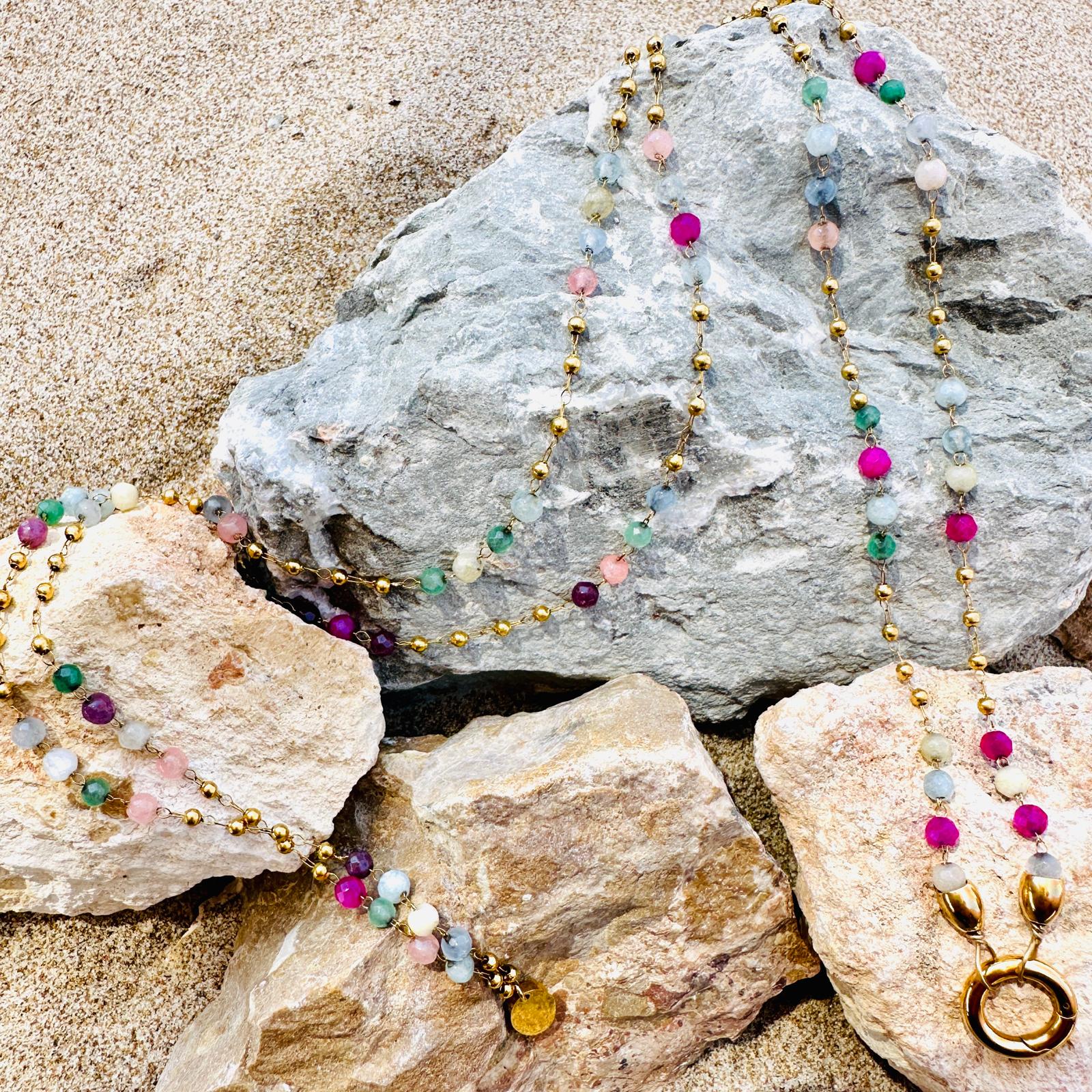 Eine zarte Verbindung aus lichtdurchwirkten Edelsteinen und goldenen Details - für Leichtigkeit im Außen und Ruhe im Inneren.