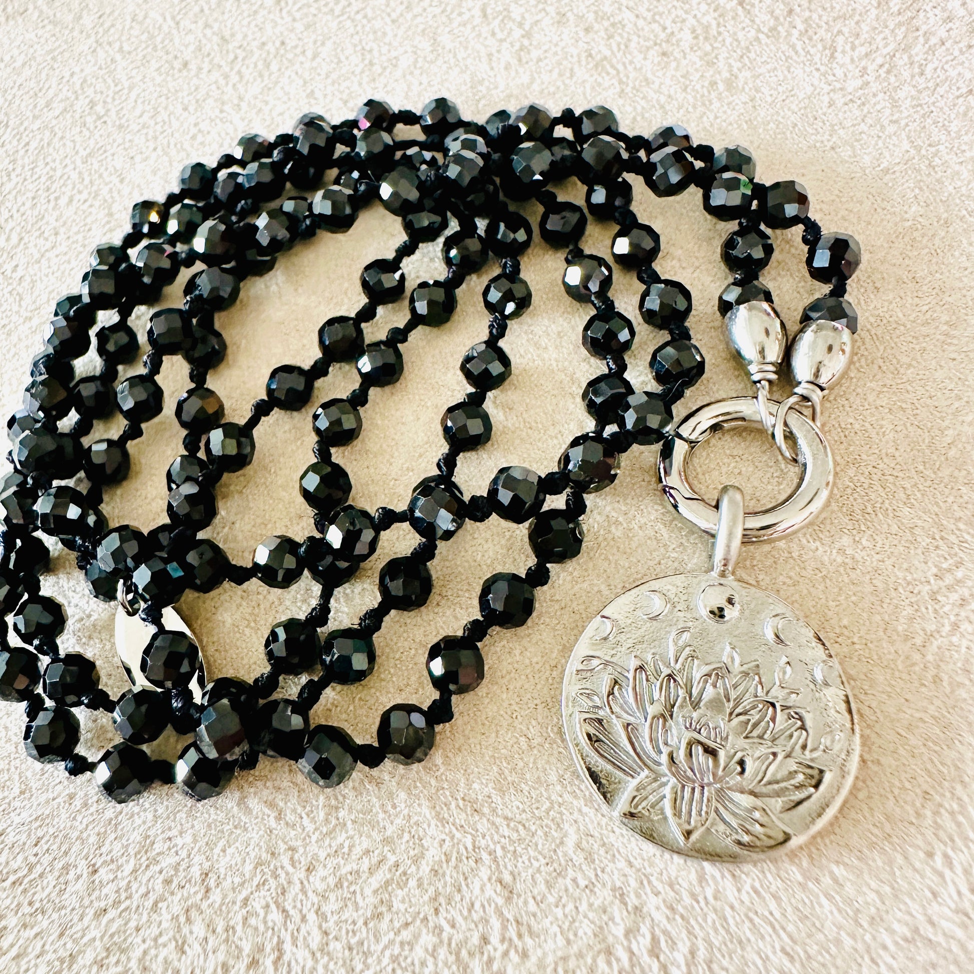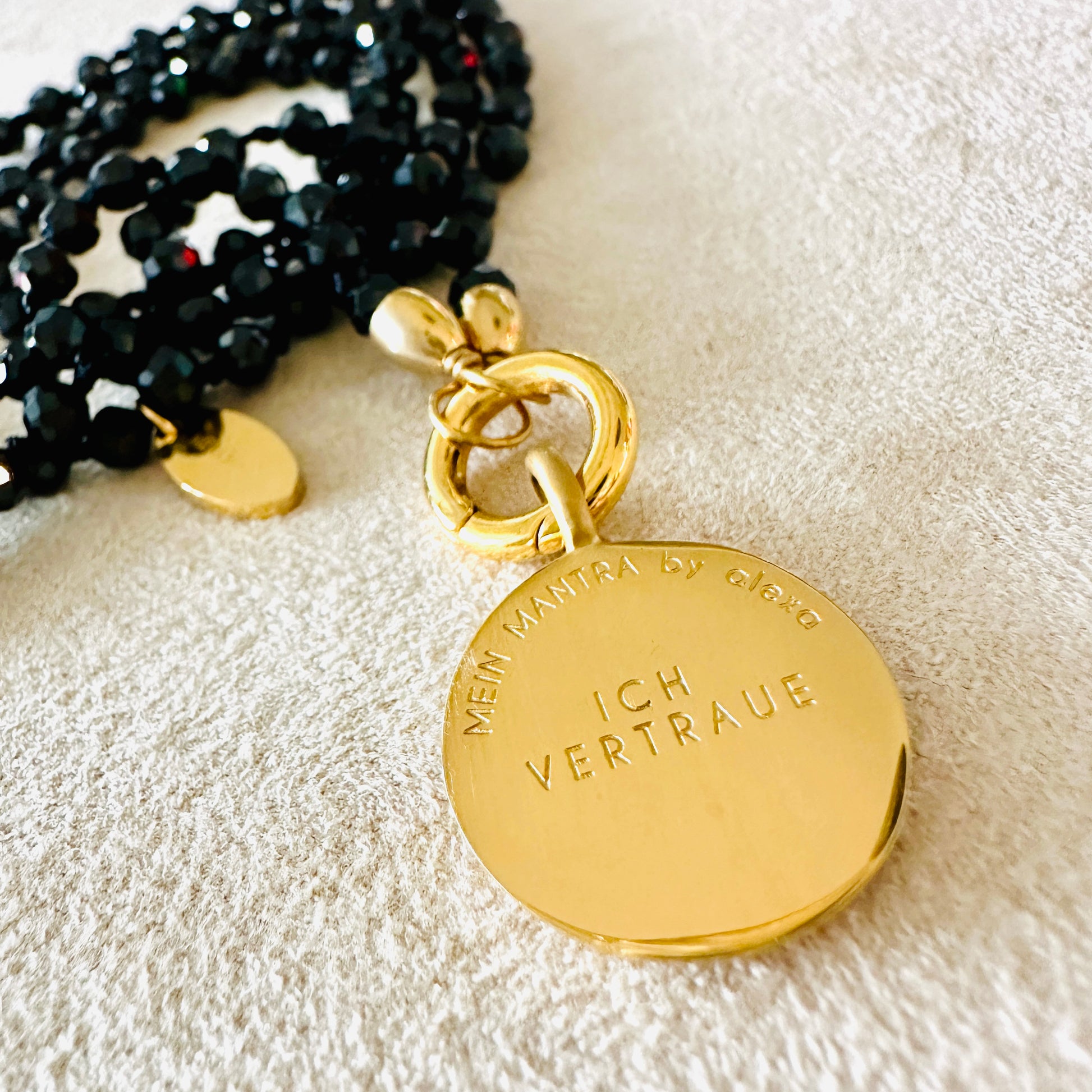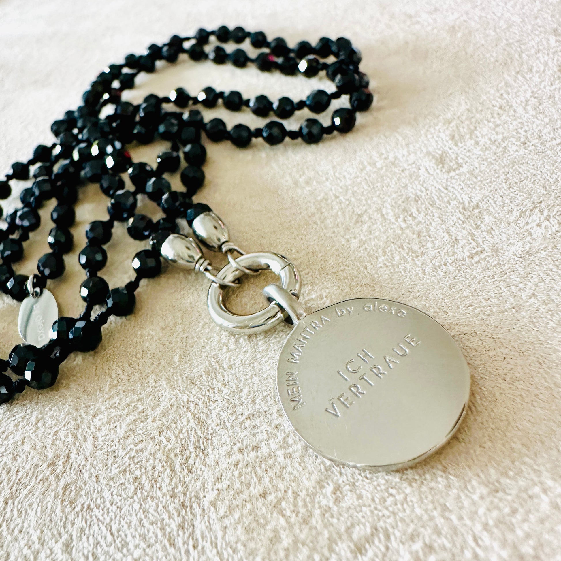 Die Edelsteinkette aus feinem Spinell trägt das kraftvolle Mantra „Ich Vertraue“ – eingraviert in einen filigranen Mandala-Anhänger aus hochwertigem Edelstahl.