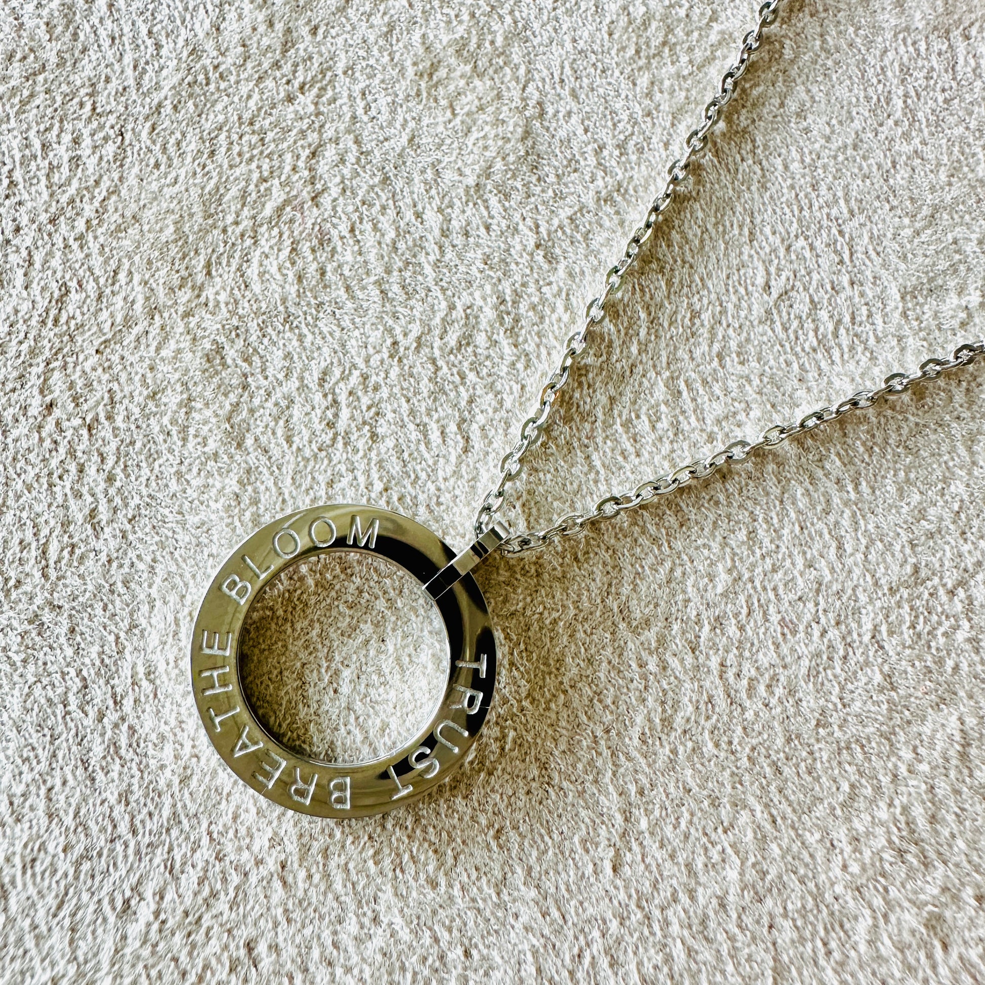 Trage die inspirierende Botschaft "TRUST BREATHE BLOOM" mit dieser eleganten Mantrakette aus Edelstahl in Silber oder Gold. Die Kette ist hypoallergen, wasserfest, langlebig und nachhaltig.